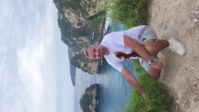 A man squats on a dirt path, dressed in a white t-shirt with a horse design, grey shorts, and white sneakers. He's touching green vegetation at the edge of the path. Behind him, a scenic view of ocean water with rocky islands and cliffs covered in greenery stretches out. The sky is overcast with a visible formation of birds flying across it.