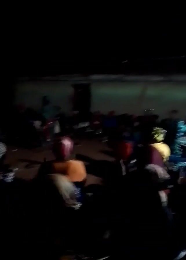 The video, filmed at night, shows a group of people gathered inside what appears to be a modest, dimly lit building. Individuals are moving around, some walking and others appearing to be dancing or celebrating. There's a visible wall in the background. The overall atmosphere suggests a community gathering or celebration, but the poor lighting makes it difficult to discern specific details or interactions.