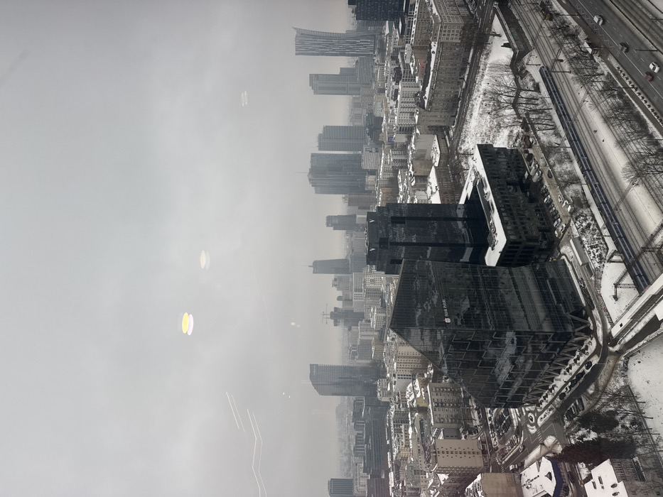 The image depicts an expansive aerial view of the city of Warsaw, Poland, specifically focusing on the Wola district and extending towards the city center, viewed on an overcast winter day. The vantage point is from a high-rise building, looking generally east-southeast. The sky is uniformly grey and overcast, reflecting interior artificial lights as two prominent yellow/white circular blurs and several faint linear white streaks on the viewing window. The urban landscape below is blanketed by a thin layer of white snow covering roofs, undeveloped plots, and bare deciduous trees. In the mid-ground, two prominent modern dark-glass skyscrapers dominate the view. The structure on the left is angular and faceted, displaying a "Bank Pekao" logo on its facade, identifying it as the Skyliner building at Prosta 67. To its immediate right, a slightly taller, more rectangular dark-glass building is visible, likely part of the same complex or a neighboring structure. Surrounding these modern towers are numerous lower-to-mid-rise residential and commercial buildings, their rooftops uniformly covered in snow. In the foreground, running from left to right across the lower third of the image, are multiple parallel railway tracks, largely dusted with snow. A multi-car train, appearing as a dark blue and white segment, is visible on one of these tracks, stationary or moving slowly. Adjacent to the railway tracks, a multi-lane road is visible with several small vehicles, including red and white cars, traveling or parked. Parking lots with vehicles, partially covered in snow, are present near the buildings. The background reveals a dense cluster of high-rise buildings and skyscrapers forming the Warsaw skyline, fading into the hazy distance under the overcast conditions. Notable structures include distinct tall office towers characteristic of Warsaw's contemporary architecture, with their upper sections sometimes obscured by the atmospheric conditions. No individual persons are discernible due to the elevated perspective and distance.