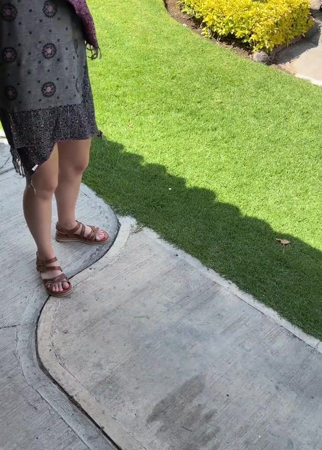 A woman stands on a concrete patio beside a lawn, holding a halved coconut. She drops the coconut halves onto the concrete, breaking them into pieces.