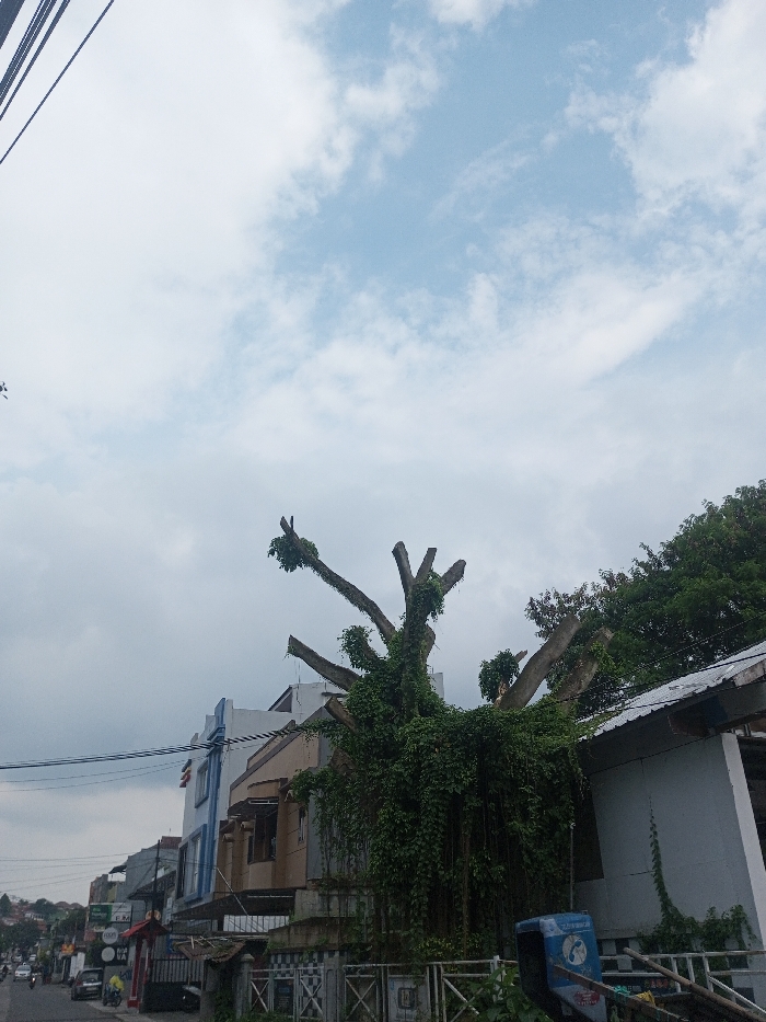 A large tree, heavily overgrown with green vines, stands in front of buildings along a street. The tree's branches are thick and appear to be cut off, with only small clusters of leaves remaining at the ends. The buildings vary in design and color. Above, the sky is filled with a mix of clouds, ranging from pale blue to gray. The scene captures a somewhat overgrown urban environment, with the tree as a prominent feature.