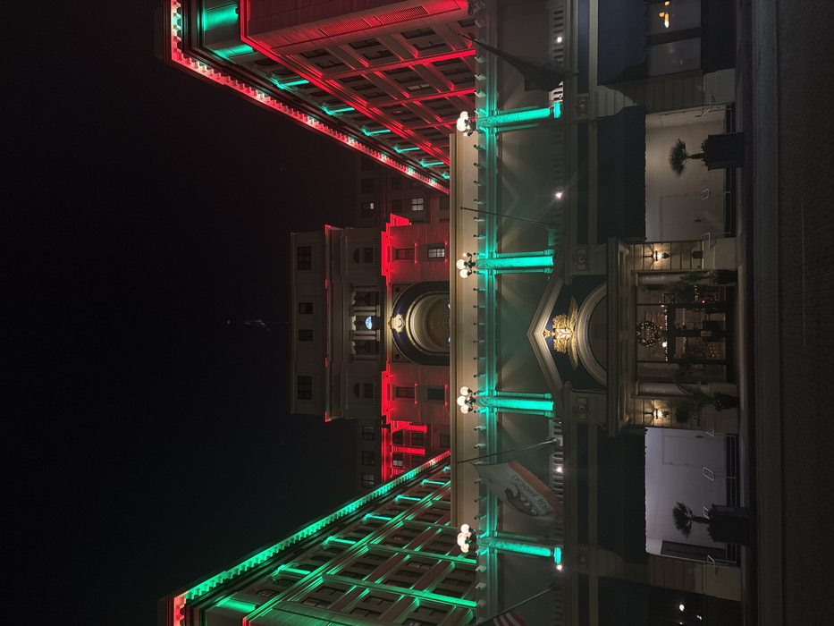 A nighttime shot of a large building adorned with red and green lights, reminiscent of Christmas decorations