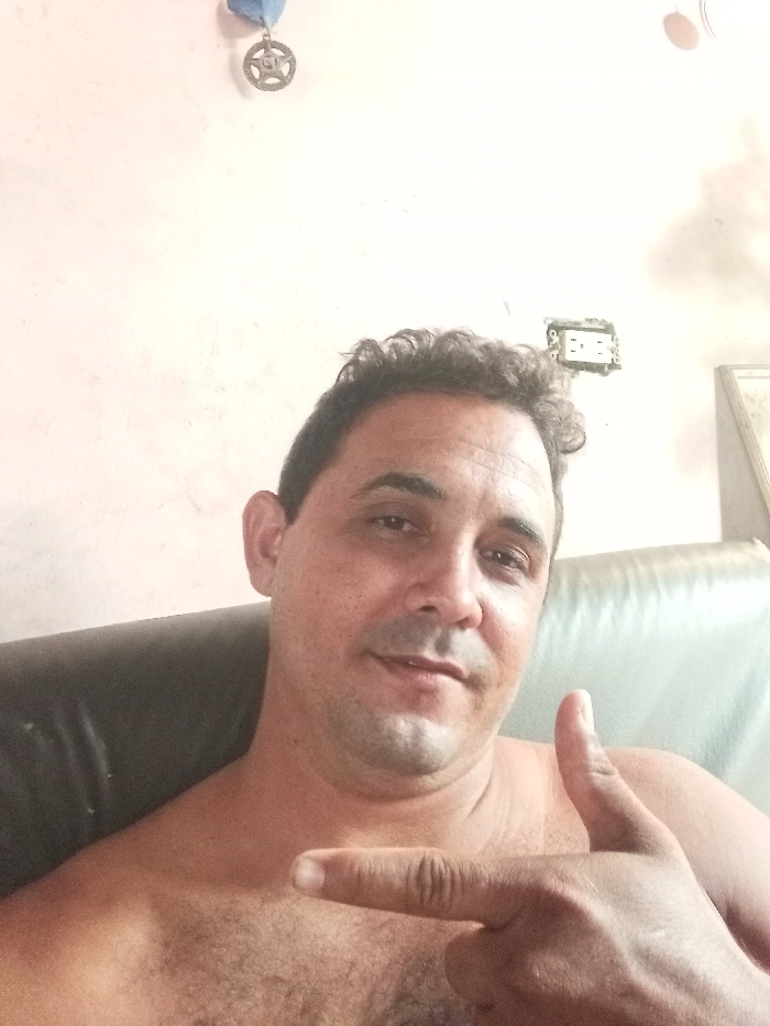 A shirtless man with curly hair points to the left with his right hand. He sits on a dark leather couch against a light pink wall. An electrical outlet and a medal hang on the wall behind him. The picture is a close-up selfie.