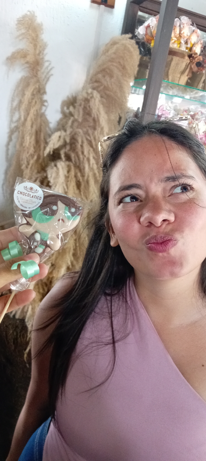 An indoor, close-up image captures a female individual holding a chocolate lollipop in what appears to be a commercial establishment in Colonia Tovar, Venezuela