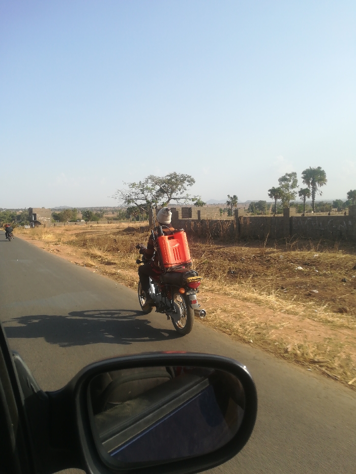 - "A motorcyclist with a bright orange tank strapped to his back drives along a rural road" by FM-FCgvq2, licensed under CC BY 4.0