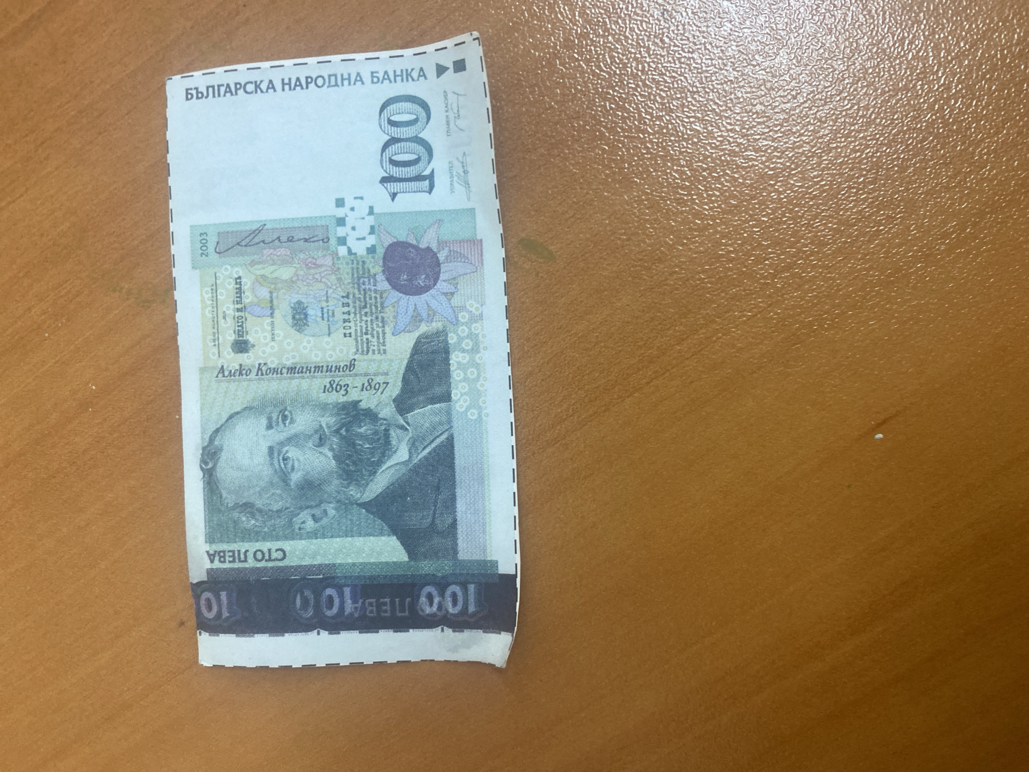 - "The image displays a single Bulgarian 100 leva banknote, issued in 2003, positioned on a textured, light brown to orange-brown surface, likely a tabletop" by FM-0I7en1, licensed under CC BY 4.0