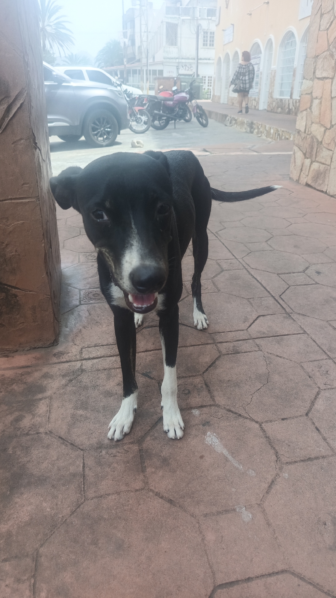 medium-sized black dog with white markings on its face, chest, and paws, standing on a reddish-brown tiled surface. The dog is looking directly at the camera with its mouth slightly open. In the background, there is a car, two motorcycles, a person walking away, and buildings. The location is identified as Juan Griego, Venezuela.