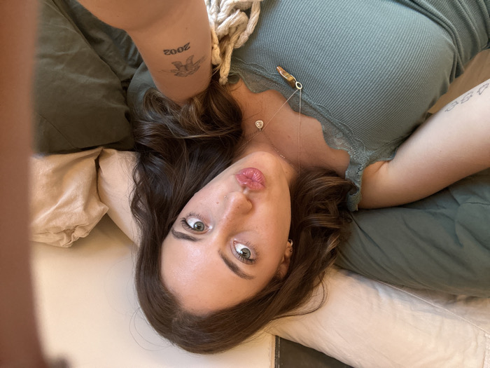 - "A young adult female is depicted in an overhead, close-up selfie, lying on her back indoors" by FM-P0ePn2, licensed under CC BY 4.0