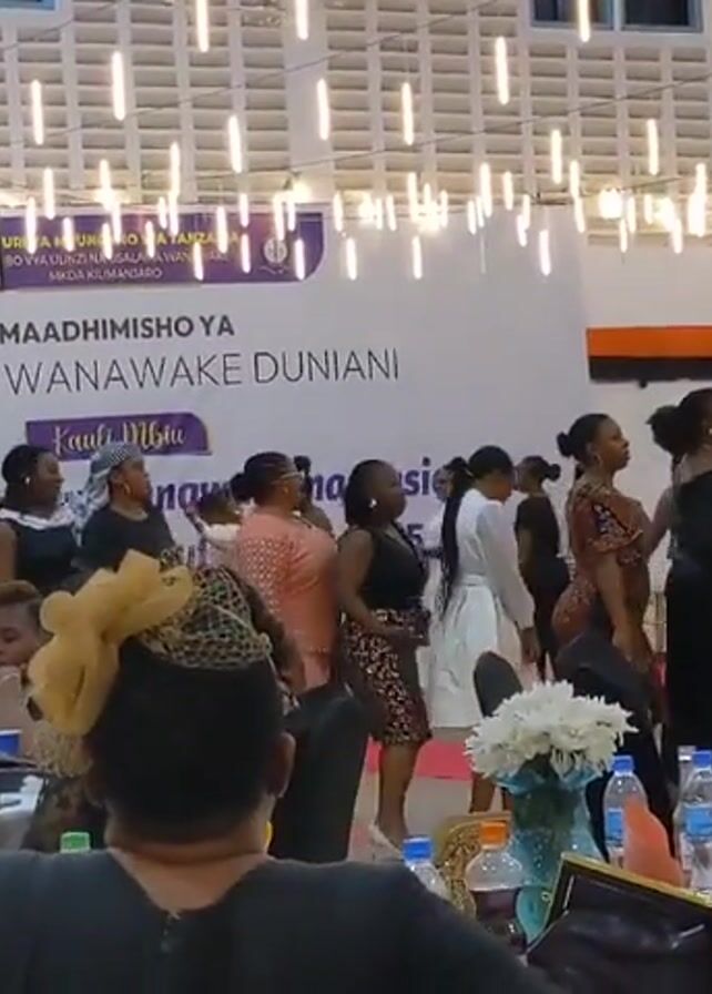 gathering of women at an event celebrating International Women's Day. The banner on the wall reads "MAADHIMISHO YA SIKU YA WANAWAKE DUNIANI". Some women are dancing in the center, while others are seated at tables, some using their phones. The tables are decorated with flowers and bottles of water and soda. Overhead are hanging string lights. The room is large with white walls and windows near the top. The women are wearing various dresses and formal attire.