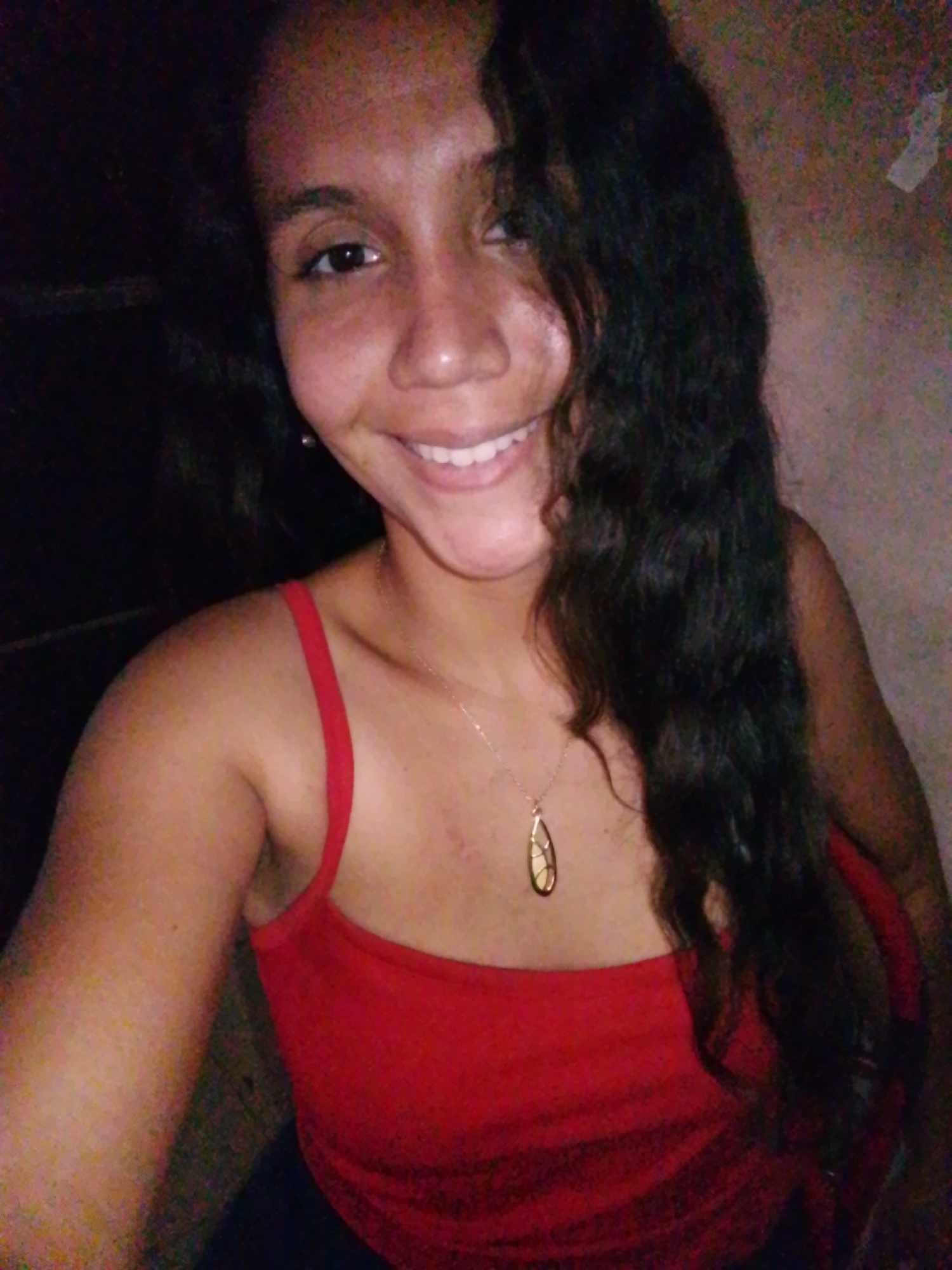 A woman with dark, wavy hair and a red tank top smiles at the camera. She is wearing a gold necklace with a teardrop-shaped pendant. The background is dark and indistinct, possibly an interior setting. There is no clear indication of the location being Juan Griego, Venezuela, or any city, from the visual information provided.