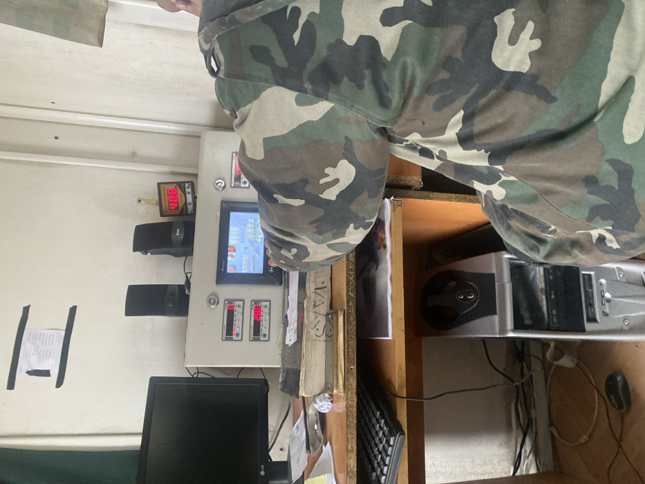 The image depicts an indoor scene within a facility in Dahiyat Harasta, Syria, focusing on a workstation. A person, whose back and right side are visible, wears a camouflage-patterned long-sleeved shirt and is positioned at a desk. Their right arm extends towards a control panel. On the wooden desk, from left to right, are a black LG computer monitor, several papers, a small dish or ashtray, and a stack of books, one displaying Arabic script. A black computer keyboard rests further left on the desk. Below the desk, a silver desktop computer tower is situated on a lower shelf, and a black computer mouse is on the floor beside it. Numerous cables are visible connecting the equipment. Behind the monitor and books, a large, light-grey control panel unit is present. On top of this unit are two black computer speakers and a separate small red digital display indicating "43.8". The face of the control panel features multiple smaller digital displays, showing values such as "0" and "190.6", alongside a central color touch screen interface displaying graphical process information. The person's right hand is near this touch screen, suggesting interaction with the controls. The background consists of a light-colored, possibly white, painted wall. A piece of paper, secured with black tape, is affixed to the wall above the monitor. The overall environment appears functional, with visible signs of use and minor disarray.