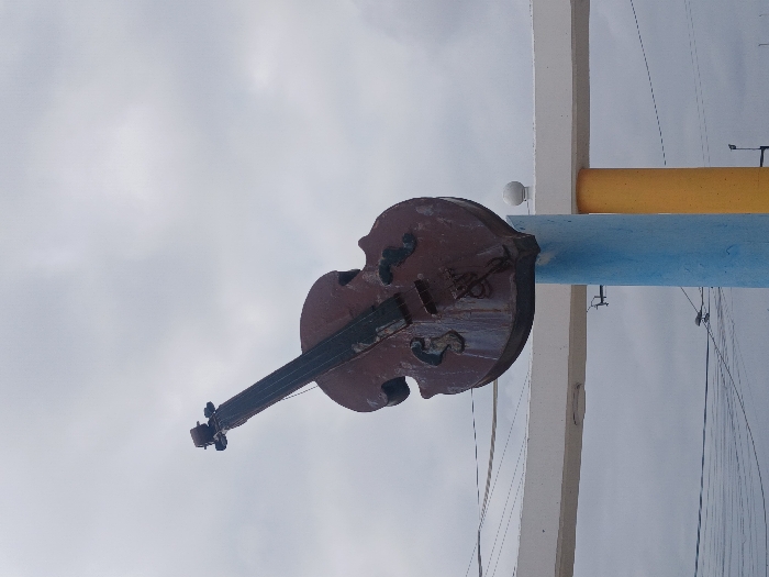 A brown, oversized, and seemingly metal stringed instrument, reminiscent of a cello or double bass, is mounted on a blue cylindrical structure. Above the blue cylinder is a yellow cylinder. The entire structure is set against a backdrop of a cloudy sky. Wires are visible on the right side, suggesting it is outdoor and perhaps near a utility pole. The base of the structure is white.