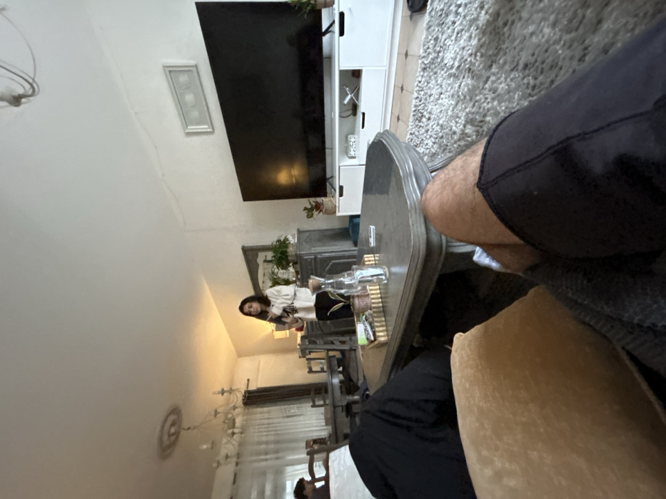 The image depicts an indoor scene, a combined living and dining area, located in Saint-Quentin, France. The perspective is from a low vantage point, likely from a seated position on a couch. In the immediate foreground, to the lower right, the legs of an individual wearing dark shorts are extended forward, resting on a dark, patterned throw. A beige pillow is partially visible on the lower left. Centrally positioned in the midground is a dark, ornate coffee table with a sculpted edge. On the table, from left to right, are a rectangular woven basket containing small items, a small potted plant, a clear glass carafe with a stopper, containing water, and a small silver object, possibly a remote. Behind the coffee table, a large, shaggy, light-colored rug covers part of the tiled floor. In the mid-left, a young adult female with long dark hair, wearing a light-colored long-sleeved top and dark pants, stands facing slightly left. She holds a dark-colored object, possibly a mobile phone, with both hands near her chest. Behind her is a dark, ornate sideboard with a mirror above it. A table lamp emitting a warm glow and a potted plant are visible on the sideboard. To the far left background, a dining area is visible with a dark-colored rectangular dining table and chairs. Another individual is partially visible seated at the far side of the dining table, facing away from the camera. A multi-armed chandelier hangs above the dining table. A window with light-colored sheer curtains and darker drapes is visible on the far left wall. To the right, a large, black, flat-screen television is positioned on a white media console. The console features multiple white drawers and open shelves, with some items visible on the shelves, including a decorative "X" shape. A small potted plant sits on the far right of the console. Above the television, a rectangular framed artwork containing three circular white elements is mounted on the wall. Power cords are visible running along the white wall above the television. The ceiling is white, featuring a decorative medallion above the dining area. The overall lighting appears bright, combining natural light from the window and artificial light sources within the room.