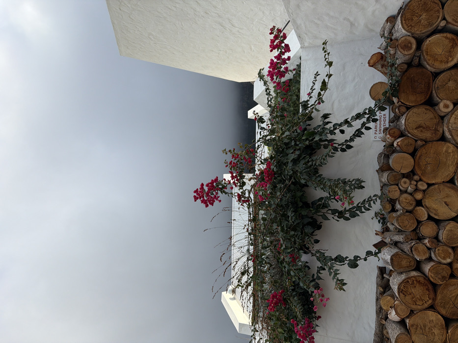 An outdoor scene in Hout Bay, South Africa, is depicted under an overcast sky. The foreground features a neatly stacked pile of cut firewood logs, varying in diameter, with their light brown cross-sections and growth rings facing the viewer. Above the logs, a textured white wall extends horizontally across the frame. A vibrant bougainvillea plant with dense green foliage and numerous clusters of fuchsia-pink bracts drapes over the white wall. A small, white rectangular sign, partially obscured by foliage, is affixed to the wall; visible text includes "PARKING," "SWIMMING," and "LAVENDER." In the midground and background, multiple white buildings with pitched roofs and modern angular architectural elements are visible, set against a dark grey, misty sky that suggests obscured mountains. No individuals or active subjects are present.