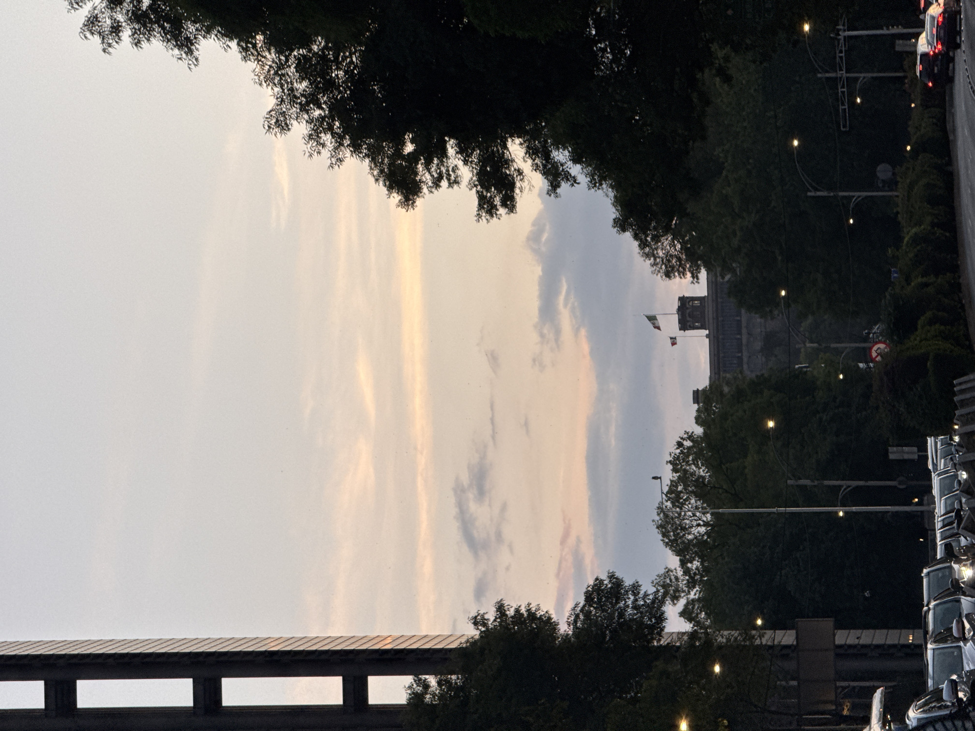 The image depicts an urban scene at dusk in Mexico City, Mexico, with the Palacio Legislativo de San Lázaro (Chamber of Deputies) visible in the background. The sky features pale pink, orange, and light grey clouds characteristic of sunset or sunrise. In the foreground, a multi-lane paved road runs horizontally across the bottom, occupied by multiple vehicles. Cars are visible in various lanes, some with illuminated headlights and taillights, suggesting traffic. Hedges or dense bushes line sections of the road. Several illuminated streetlights with bright yellow-orange globes extend from the mid-ground towards the background, casting light on the scene. A bird is perched on the arm of one of these streetlights in the mid-left portion of the frame. The mid-ground is dominated by dense, dark green trees that frame the central view, partially obscuring the urban landscape beyond. In the background, positioned centrally, the dark stone structure of the Palacio Legislativo de San Lázaro stands prominently. Its architectural details, including a central tower section, are discernible despite the distance and fading light. Two flags fly from the top of the building; the flag on the right is identifiable as the Mexican flag (green, white, and red vertical stripes). To the far left of the image, the vertical edge of a tall, modern building with a distinct grid-like or framed facade is partially visible, featuring rectangular window or panel sections that reflect a faint glow. The right side of the image is bordered by the dark silhouettes of trees.