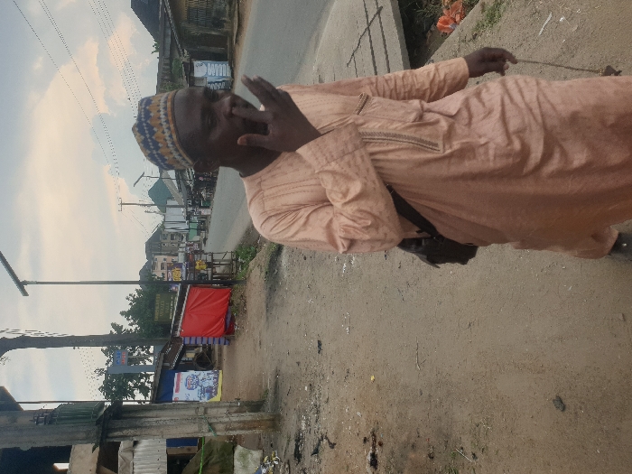 The scene depicts an outdoor street environment in the city of Umuode, Nigeria, under an overcast sky. In the foreground, a male subject with dark skin is captured in a walking or standing posture, angled slightly towards the left of the frame. He wears a light peach-colored, long-sleeved garment (likely a kaftan) with vertical embroidery on the front placket, and a blue and yellow patterned skullcap (kufi). A dark-colored messenger bag is slung over his right shoulder. His right hand is raised near his face, with fingers curled towards his nose/mouth area. His left hand is lowered, holding a string-like object with a dark, possibly metallic, pendant. To the subject's left is a dirt footpath with scattered debris, including small pieces of plastic. To his right, a paved road runs parallel to the path, extending into the distance. A small concrete culvert or drain edge separates the dirt path from the road. In the midground, on the left side of the road, stands a partially dilapidated concrete structure with exposed rebar, followed by various makeshift stalls or shops. One stall is covered by a red tarp, and another exhibits a blue sign and a red and white poster. A tall, bare tree trunk rises prominently. A solar-powered street light pole is also visible. Further down the road, a blue sign for "ANDREW ANNA & CO" is partially visible. The paved road is lined on both sides by numerous commercial structures, appearing as shops or stalls constructed from various materials, including corrugated metal. Utility poles with overhead wires run along the road. In the distant background, multi-story buildings and faint hills or mountains are visible beneath the cloudy, grey sky. No direct interaction between the primary subject and other individuals is discernible, though indistinct figures are visible further down the road.
