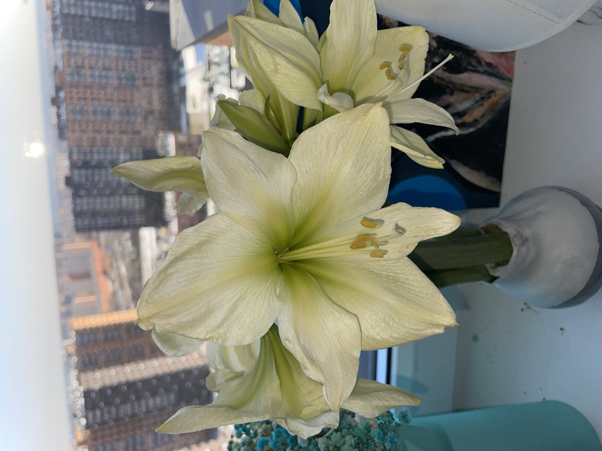 The primary subject is a cluster of three blooming Amaryllis flowers, exhibiting large, pale yellow to off-white petals with distinct lime green coloration in their throats and prominent yellow-tipped anthers. These flowers are situated upright within a small, light gray ceramic vase featuring an irregular, organic shape. The vase rests on a flat, white surface, identified as a windowsill. To the left of the Amaryllis vase, a cylindrical, turquoise-colored container holds a quantity of small, textured, light blue material, resembling dried decorative foliage. Partially visible behind the flowers on the right is a dark, abstract artwork with blurred swatches of various colors. The background, visible through a window, depicts an urban landscape of Balashikha, Russia. Multiple multi-story residential buildings dominate the view, characterized by dark grey and reddish-brown facades, some with visible window patterns. The ground and rooftops visible between buildings show indications of snow or ice cover. The sky above is clear and bright, with a discernible sun glint or reflection in the upper center of the frame, indicating daylight conditions. No individuals or active interactions are present in the scene.