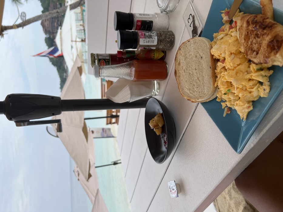 A breakfast scene on a white table near a beach, featuring a blue plate with scrambled eggs, a croissant, and a slice of bread. Salt, pepper, Tabasco sauce, and other condiments are lined up. A small black bowl with fried items sits beside them. An umbrella base and pole are visible, offering shade over the table, with the ocean and beach in the background. A small packet lies on the table's edge.