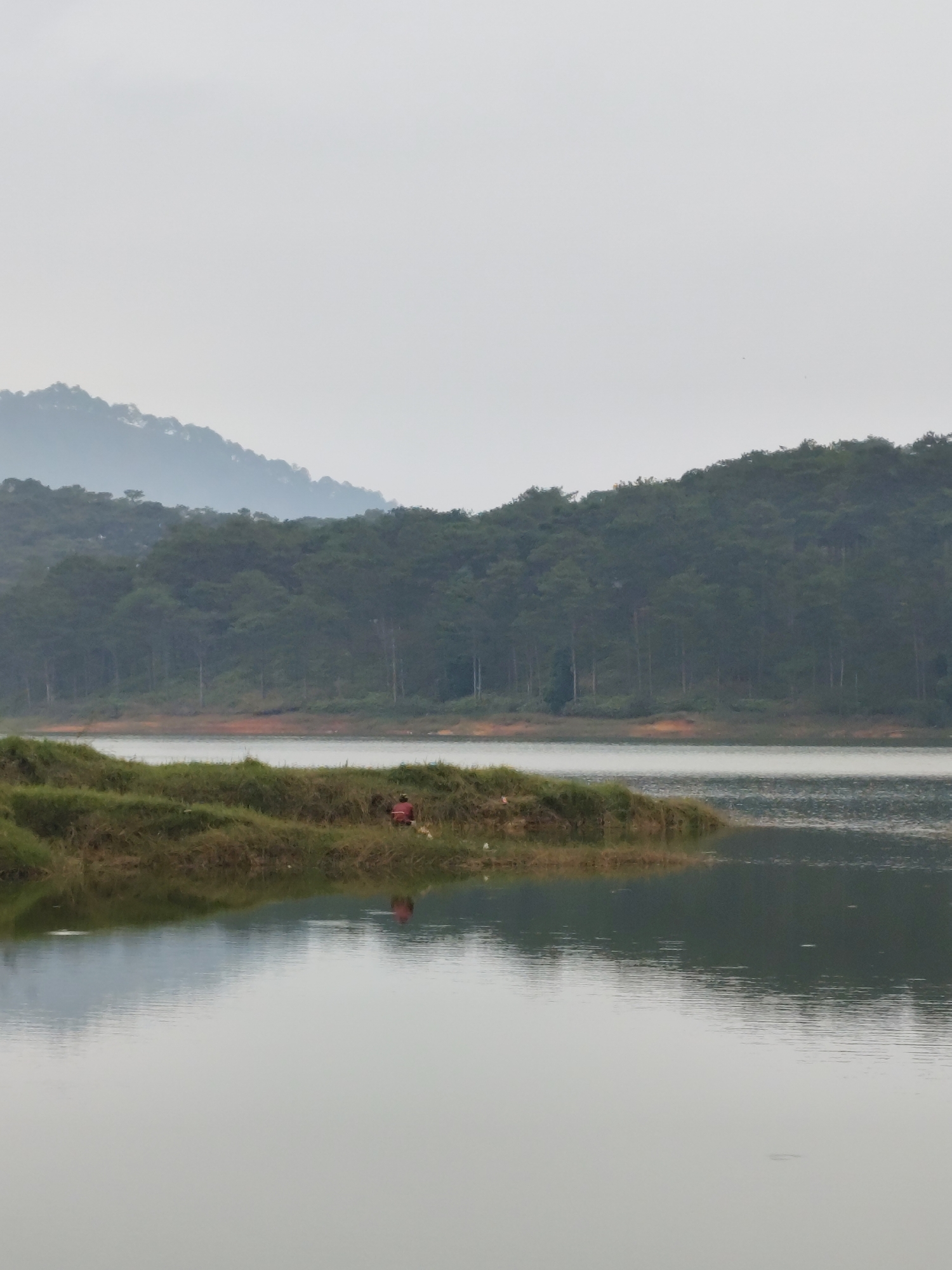 The photograph depicts a still lake landscape in Lam Vien - Da Lat, Vietnam. A grassy peninsula extends into the calm water, its reflection visible on the surface. A person, discernible by a red shirt, sits on the peninsula's edge. Beyond the lake and peninsula, a dense forest covers a hillside, which recedes into misty mountains in the background. The sky is overcast, contributing to a muted, gray tone throughout the scene.