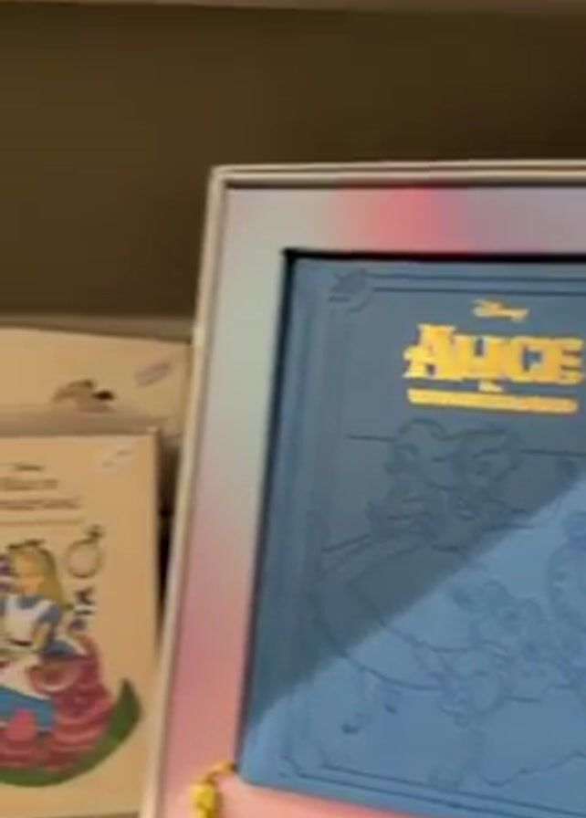 shelf stocked with Disney-themed merchandise. The main focus is on items related to Alice in Wonderland, including notebooks, mugs, and diaries. The notebooks feature classic illustrations of Alice and other characters from the story. The mugs have images of the Queen of Hearts and Alice. There is also a Snow White diary. The environment suggests a retail setting.
