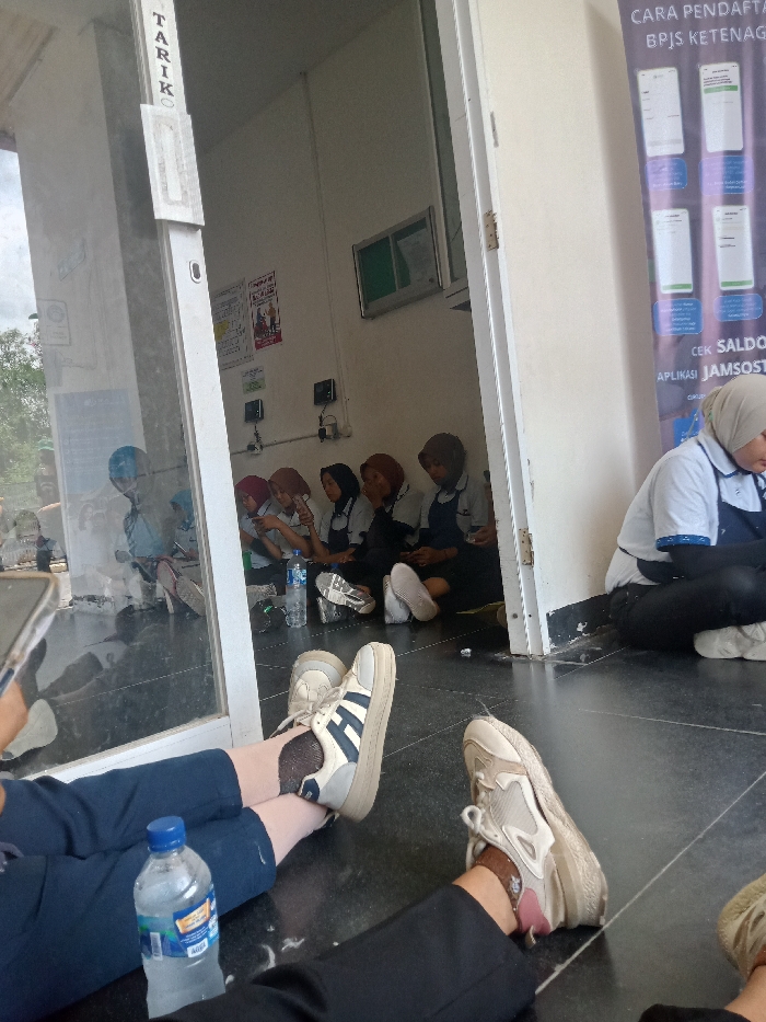 The image depicts an indoor scene, likely a waiting or break area, in the city of Unknown, Unknown, with an inferred location in Indonesia based on visible text. The perspective is from a low vantage point, showing two distinct areas separated by a glass panel and an open doorway. The floor is dark tiled. In the immediate foreground, the lower extremities of two individuals are visible, seated on the floor with legs extended. One wears dark blue trousers and grey/white striped sneakers, with a plastic bottle of Aqua-brand water adjacent. The other wears black trousers and light-colored chunky sneakers. To the right of an open doorway, a woman in a light-colored hijab, white collared shirt with blue trim, and a dark apron is seated on the floor, looking downwards. Behind her, a vertical banner advertises "BPJS Ketenagakerjaan" and "APLIKASI JAMSOS TE" (likely Jamsostek) with mobile interface graphics. Through the glass panel and open doorway, approximately five to six women are observed seated on the floor against a light-colored wall in an adjacent room. They are uniformly dressed in light-colored tops, dark aprons, and hijabs of various colors. Multiple individuals in this group are engaged with mobile phones. A plastic water bottle and a wall-mounted green-framed notice board are also visible in this area. A "TARIK" (PULL) sign is affixed to the frame of the glass panel.