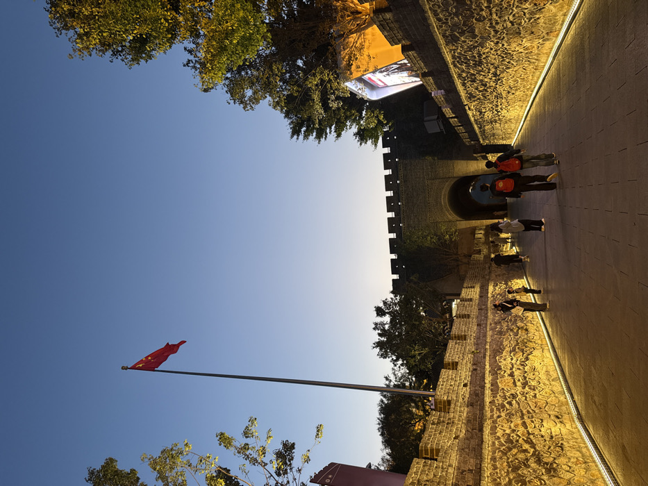 The scene depicts a paved pedestrian pathway at dusk within a fortified architectural complex in Yanqing District, China