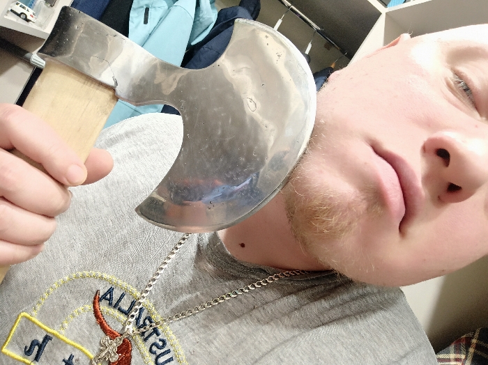 A person holds a shiny, broad-bladed axe against their neck, the blade reflecting light. The axe has a wooden handle. The individual is light-skinned with a short, light beard, eyes closed, and their face angled upward. They wear a gray shirt with a large embroidered design and a silver chain necklace with a cross pendant. In the background, shelves are visible, containing various items including clothing and miniature vehicles.