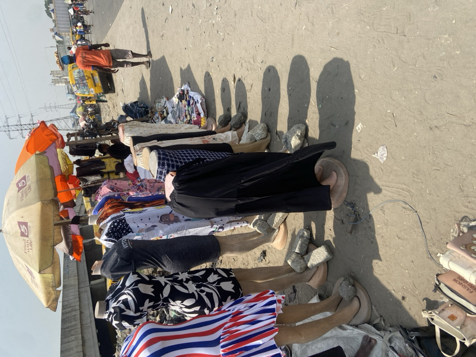 An outdoor market scene is depicted in Alasia, Nigeria, under a clear, bright sky. The foreground features a linear display of approximately ten headless and armless female mannequins, positioned along the edge of a dusty, light-brown earthen path. These mannequins wear various garments: a red, white, and blue striped ruffle-hem dress; a black and white floral pattern mini-dress; a dark grey t-shirt dress with "VICTORIA'S SECRET" text; a multi-patterned long dress; a black tiered dress; a blue and white checkered skirt; and light-colored trousers. Each mannequin stands on a round, flat base, many secured by grey concrete blocks or stones. To the far left foreground, light-colored handbags rest on a tarp. In the midground, behind the mannequin display, a market stall operates under several large umbrellas, including a yellow and red/orange umbrella with "5" and "Filled With Life" branding. Clothing is visible on racks beneath these umbrellas. Several individuals are present, including a person seated under the umbrellas and a person wearing an orange t-shirt and light-colored shorts walking away from the viewer on the dusty path. A yellow mini-van or bus is parked or moving on a dirt road adjacent to the market stalls. The background shows a large concrete overpass or bridge structure dominating the left and central upper frame. Power lines and transmission towers are visible further in the background, along with what appear to be industrial structures or silos. Strong sunlight from a high angle casts distinct, elongated shadows to the right of the mannequins and other objects. The overall environment appears dry and dusty.