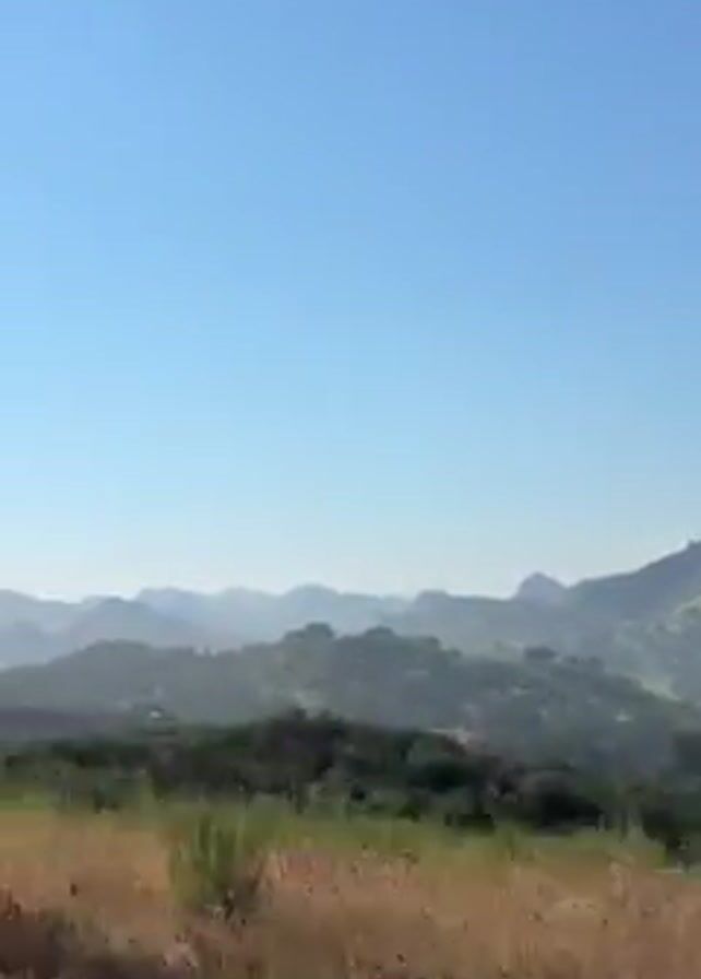 mountainous landscape under a clear blue sky. The view is captured from a moving vehicle or handheld camera. In the beginning, the landscape is visible. Then, a utility pole is seen followed by a yellow traffic sign warning of a left curve with a speed limit of 35 mph. After that, the landscape is visible again with a dirt path in the foreground.