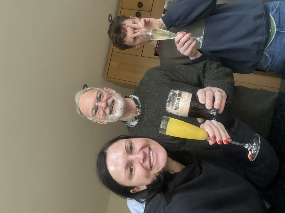 Three individuals are depicted indoors within a domestic setting, specifically a kitchen or dining area in Wealden, United Kingdom, identified by light-colored walls and light brown wooden cabinetry. The person on the left is an adult female with dark hair, looking towards the camera with a smile. She is wearing a dark hooded garment and holds a champagne flute containing an orange liquid. Her fingernails are painted red. The central figure is an elderly adult male with a gray beard and glasses, also smiling at the camera. He wears a plaid collared shirt beneath a dark green knitted sweater and holds a pint glass of Guinness. A ring is visible on his left hand. The person on the right is a young adult male with short brown hair, wearing a dark blue sweatshirt with a striped collar and blue jeans. He holds a champagne flute containing a light yellow liquid and is simultaneously making a 'peace' sign with his left hand, positioned near his face. All three individuals are actively holding their beverages, posing for the photograph.