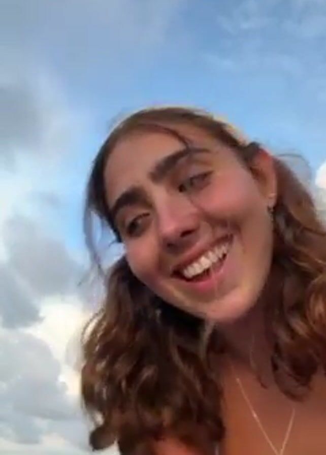 A woman with curly brown hair and a silver necklace looks into a camera. She sticks out her tongue, smiles, and puckers her lips. A man with dark hair and a black cap stands next to her, smiling. The background is a blue sky with some clouds.