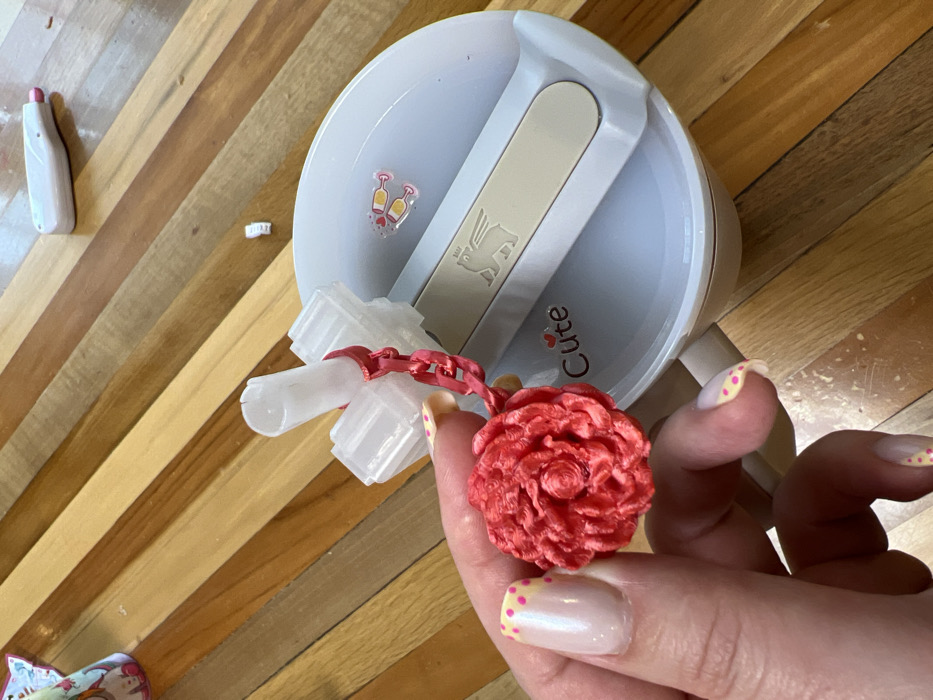 The scene is set in the city of Dospey, Bulgaria. A human hand, displaying manicured nails with a pearlescent white base and yellow polka dots on the tips, is positioned in the foreground, holding a small, textured red floral charm. This charm is connected by a short red plastic chain to a clear plastic tube, which is further attached to two clear, ribbed plastic clip components. To the right of the hand, a light-colored, circular or cylindrical device rests on a wooden floor. This device features a beige rectangular slider with an embossed winged animal symbol and the text "Cute" accompanied by a red heart icon. Two small stickers, one depicting champagne flutes, are affixed to the device's surface. In the upper right portion of the frame, on the wooden floor, a white pen-like object with a pink tip and a small, fragmented white plastic piece are visible. The floor consists of parallel wooden planks exhibiting varying shades of brown.
