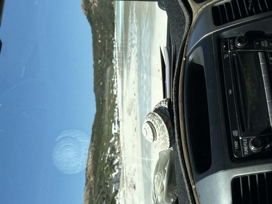 The image presents a forward-facing view from inside a vehicle, showcasing a coastal landscape near Condingup, Australia. In the immediate foreground, the dark gray dashboard of the vehicle is visible, featuring an off-white, spiraled seashell, a crumpled translucent plastic object, and a dark-bound notebook resting on the dash mat. Below these items, a silver-gray car stereo unit with buttons labeled "LOAD" and "TUNE-FILE" is partially visible. The vehicle's windshield, displaying a prominent circular, rippled smudge in the upper left quadrant, frames the exterior scene. Beyond the windshield, a wide, pale sandy beach stretches horizontally, leading to a body of light blue water, likely the ocean, with patterns suggestive of low tide. Along the transition between the beach and the rising terrain, multiple white recreational vehicles or temporary structures are scattered. The background consists of low, green, vegetated hills under a clear, bright blue sky. No human figures are discernible within the scene.