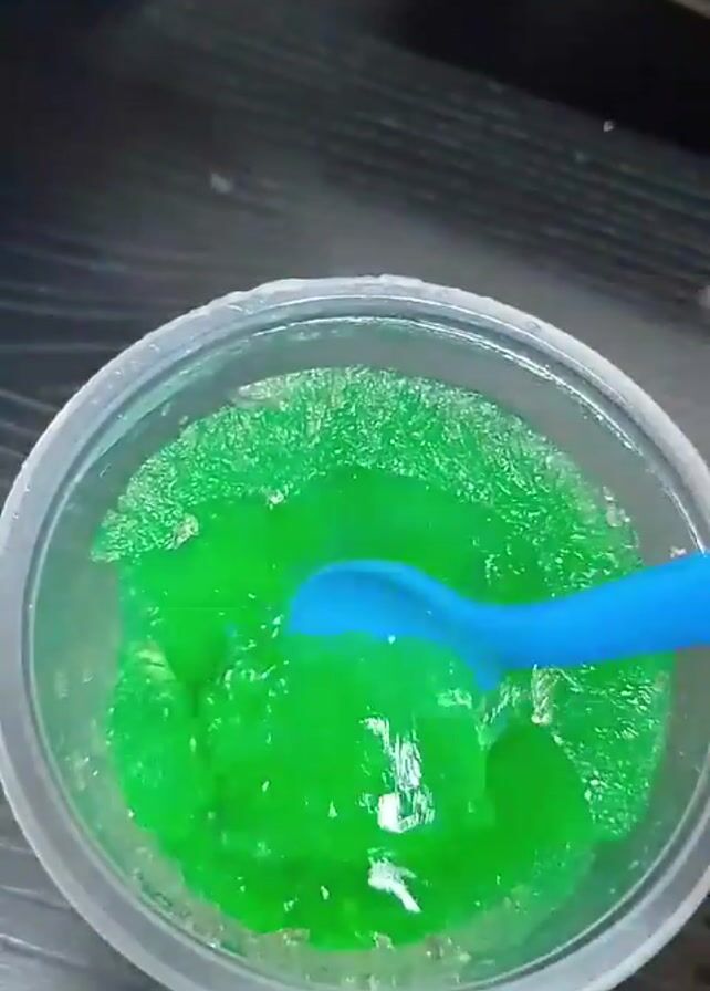 A light grey, plastic container holds a bright green, gelatinous substance. A blue plastic spoon is being used to stir the green substance in a circular motion. The container sits on a dark wooden or laminate surface. A small, blue and white package is slightly visible in the upper left corner.