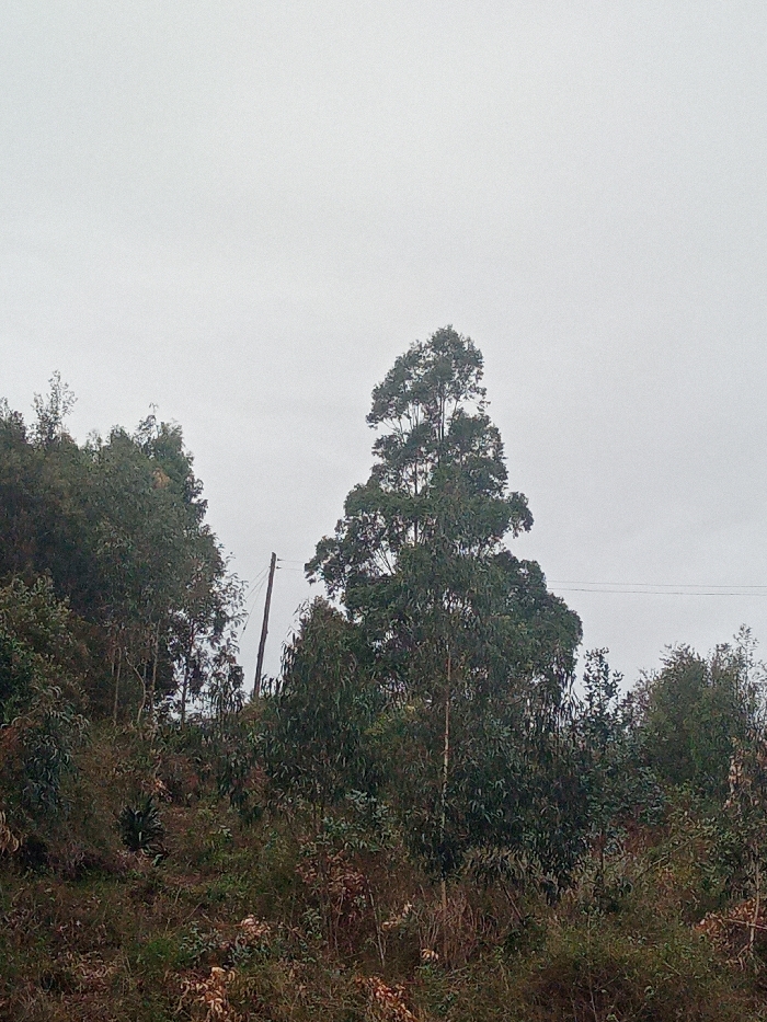 The image displays a vegetated hillside in Ndeiya, Kenya, under a uniform, overcast light grey sky. A prominent, tall, conical-shaped tree, likely a eucalyptus, stands centrally, its dark green foliage extending into the upper portion of the frame. The mid-ground and foreground are densely covered with various trees, shrubs, and undergrowth, exhibiting shades of green, brown, and some reddish-brown foliage. A single wooden utility pole is visible on the left side, partially obscured by the surrounding vegetation, with a dark utility wire extending horizontally across the mid-right portion of the image, passing behind the central tree. No human or animal subjects are present. No actions or interactions are depicted.