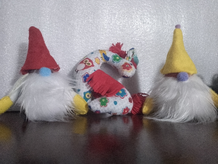 The image displays an indoor setting, reportedly located in the city of Krasnogorskoye, Russia, featuring three decorative plush figures arranged on a dark, reflective surface against a light, textured wall. From left to right, the objects are: 1. A gnome-like plush figure with a pointed red felt hat, a light blue spherical nose, and a prominent white faux-fur beard. Its arms and legs are depicted as yellow fabric appendages. 2. A curved, elongated plush object, possibly an abstract animal, constructed from white fabric patterned with multicolored owls and flowers. It features multiple red fringe-like elements along its body. 3. A second gnome-like plush figure, similar to the first, but with a pointed yellow felt hat topped with a small purple bead, a light purple spherical nose, and a white faux-fur beard. Its arms and legs are also yellow fabric appendages. The figures are static and appear to be positioned for display. The dark surface below them exhibits faint reflections of the objects. The background wall is a consistent light color with a subtle, granular texture.