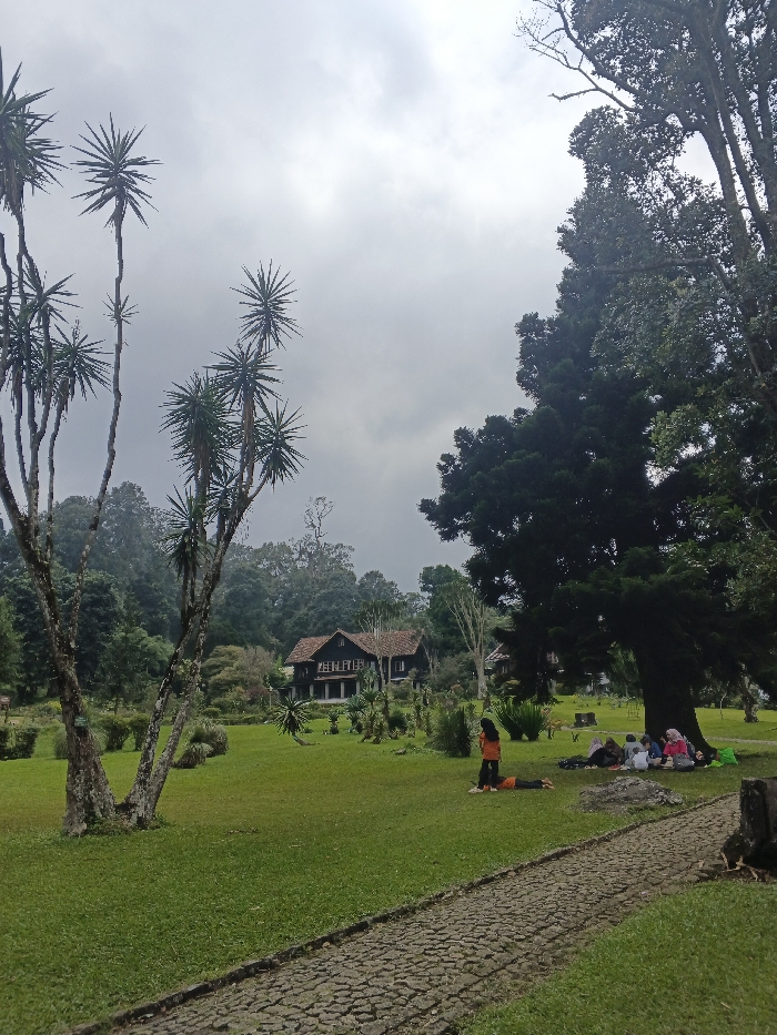 The image displays an outdoor scene in Kwekwe, Zimbabwe, characterized by a large expanse of manicured green grass under an overcast sky. In the mid-ground, a two-story house with dark walls, white pillars on its lower facade, and a reddish-brown tiled roof is visible, partially obscured by surrounding foliage. The background features a dense forest of varying trees. On the left side of the foreground, several tall, slender trees with sparse, spiky leaves stand prominently. A paved path constructed from dark, irregular stones curves from the lower right foreground towards the center-left. On the right side of the image, beneath a large, dark green tree, a group of approximately five to six individuals are seated on the grass. Further to their left, one person wearing an orange top stands upright, while another individual in an orange top lies prone on the grass.