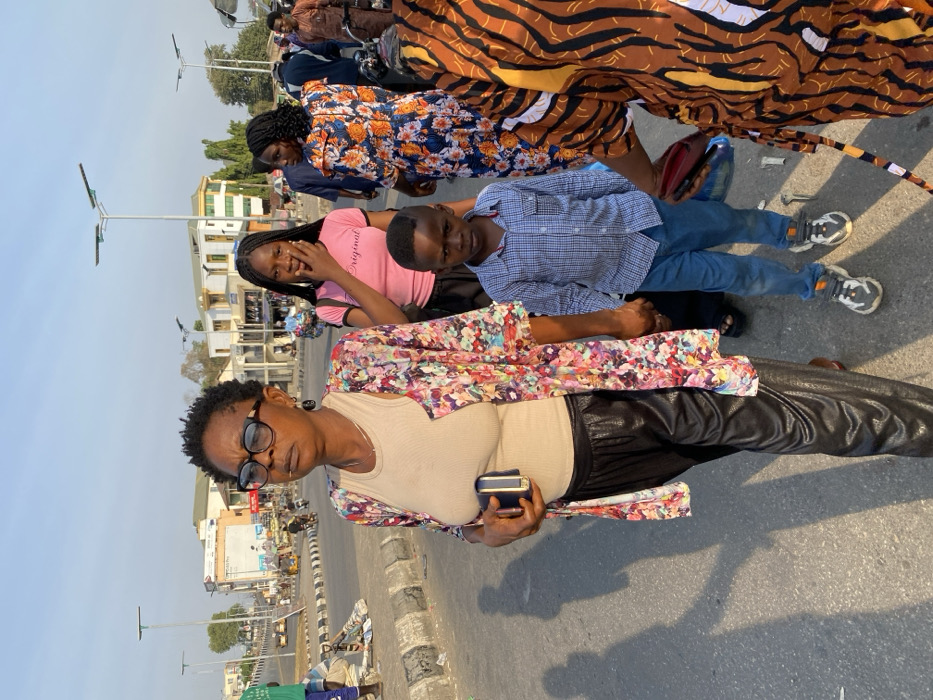 The image depicts a bustling street scene in Lokoja, Nigeria, under clear daylight conditions, indicated by strong sunlight and shadows cast on the asphalt