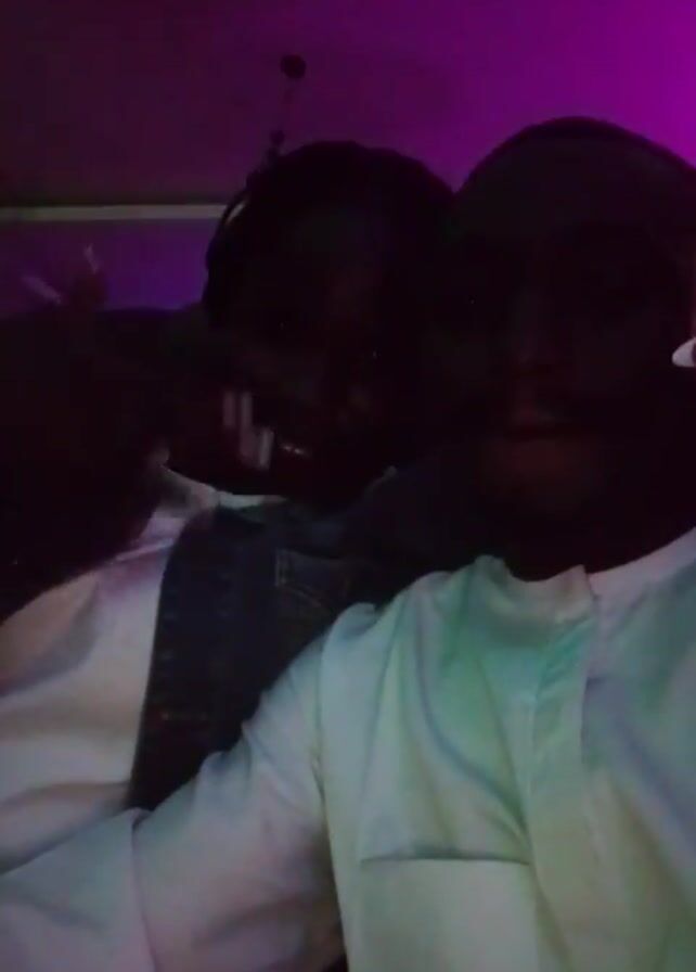 Two dark-skinned men pose for a selfie in a dimly lit room with changing colorful lights. The man on the left wears a white shirt and a denim jacket. The man on the right wears a white long-sleeved shirt. The room appears to be a nightclub or bar with the light reflecting off surfaces. Both men smile at the camera.