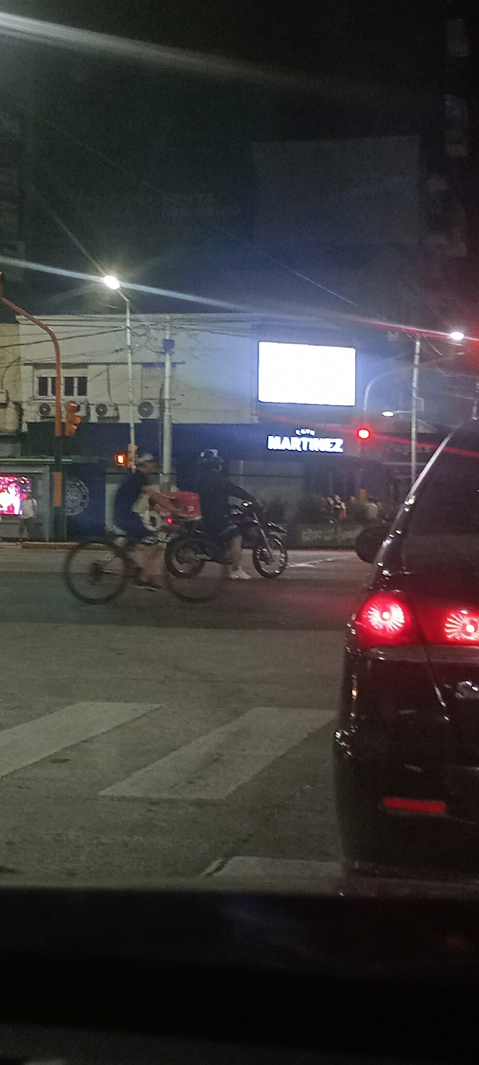 At night, a cyclist and a motorcyclist traverse a pedestrian crossing. The cyclist is on the left, while the motorcyclist carries a delivery box. Above them, a building displays "MARTINEZ" in large letters under a bright screen. A traffic light is red. The scene is viewed from a vehicle, with the taillights of another car visible on the right.