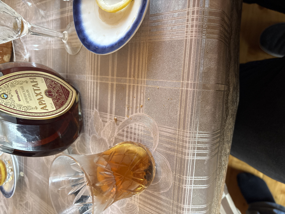 The scene depicts an indoor setting, specifically a dining or refreshment table located in Kuyuki, Russia. The table is covered with a light beige or light brown plaid-patterned tablecloth featuring subtle embossed circular designs and scattered crumbs. In the foreground, slightly to the left, a clear, cut-glass style tumbler contains an amber-colored liquid, likely a spirit, with dark particulate matter, possibly sediment or tea leaves, at the bottom. Immediately behind the tumbler, centrally positioned, is a distinctive, flat-sided glass bottle of Armenian brandy, identifiable by its label which reads "ԱՐՄԵՆԻԱՆ ԿՈՆՅԱԿ" (Armenian Konyak) and "ԱՐԱԽՏԱՆ" (Araxtan), indicating 40% alcohol by volume and a 0.5-liter capacity. The bottle contains a dark amber liquid. To the right of the brandy bottle, a small, white saucer with a blue rim holds two thin slices of lemon. Further to the right and slightly in the background, a tall, empty stemmed glass, possibly a wine or brandy glass, is partially visible. In the background to the left, a portion of another small plate holding a yellow substance is discernable. Below the table, the lower extremities of a seated individual are visible, consisting of dark trousers and dark footwear; a blue shoe is visible on the left, and a dark shoe is partially visible on the right. No other individuals are present within the frame.