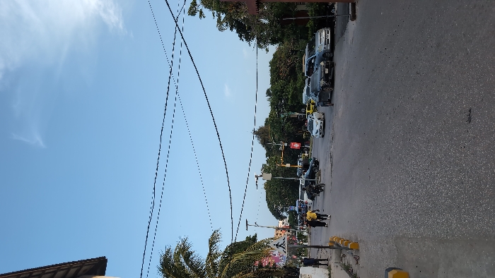 The image displays a daytime street scene at a busy intersection in Stone Town, Zanzibar City, Tanzania, consistent with the Darajani roundabout area. The sky is clear blue with faint, wispy clouds in the upper right. Several dark electrical or communication wires are stretched horizontally across the upper half of the frame. On the far left, a portion of a building's brown roofline is visible, along with green fronds from a palm tree. A grey sidewalk runs along the left edge, marked by yellow and black painted curbs or bollards. A white pedestrian crossing sign, depicting a walking figure, is mounted on a pole on this sidewalk. Three individuals are present on the left: one person in a dark shirt stands near a pole, and two others, one in a yellow shirt and one in a dark shirt, walk away from the viewer on the sidewalk. The asphalt road, appearing as a multi-lane intersection or roundabout, occupies the lower and central parts of the image. Vehicle traffic is evident, including a dark-colored motorcycle with a rider in the midground, moving towards the right. Multiple cars are navigating or stopped at the intersection, including a white sedan, a dark sedan, a light grey SUV, and a yellow vehicle visible further in the background. Approximately five cars are visible on the right side of the road, either parked or in motion. Traffic infrastructure includes multiple streetlights mounted on tall poles, some equipped with solar panels. Traffic lights, one displaying a red signal, are visible in the mid-distance. The background is dominated by a dense cluster of green trees, indicative of a park or vegetated area, with faint outlines of distant buildings partially obscured by the foliage. No specific individual interactions or noteworthy vehicle events are discernible.