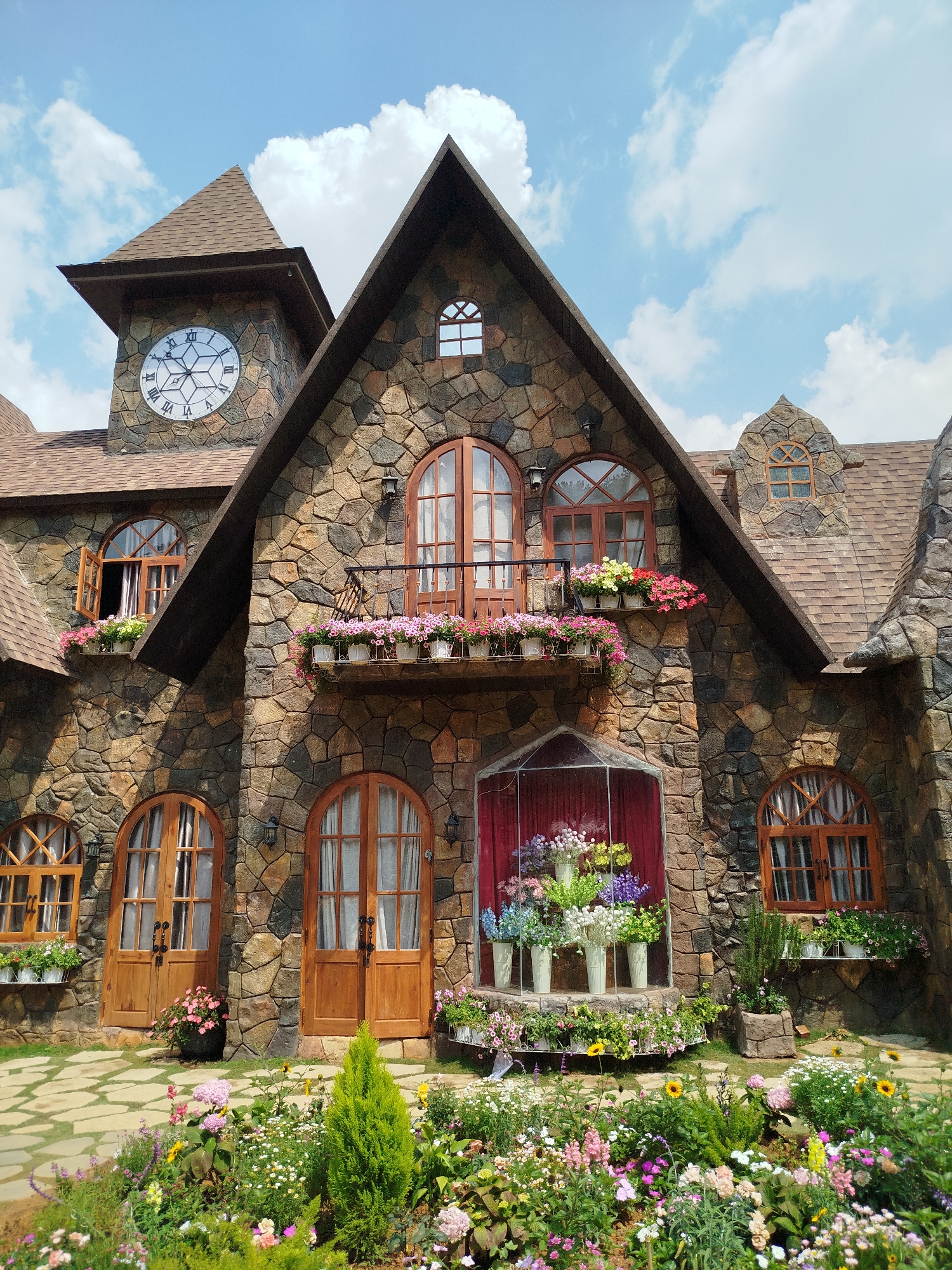 The photograph depicts a fairytale-esque stone building under a bright blue sky with scattered clouds. The building's exterior is constructed from irregularly shaped stones of varying shades of brown and gray. The structure features multiple arched wooden doors and windows, some adorned with flower boxes and plants. A small balcony with potted flowers is located above the central doorway. To the right of the entrance is a glass-enclosed display case filled with colorful flowers and greenery. A clock tower rises from the left side of the building. The ground in front of the building is covered in a garden with a diverse collection of flowers in bloom. This is located in the city of Lang Biang, Da Lat, Vietnam.