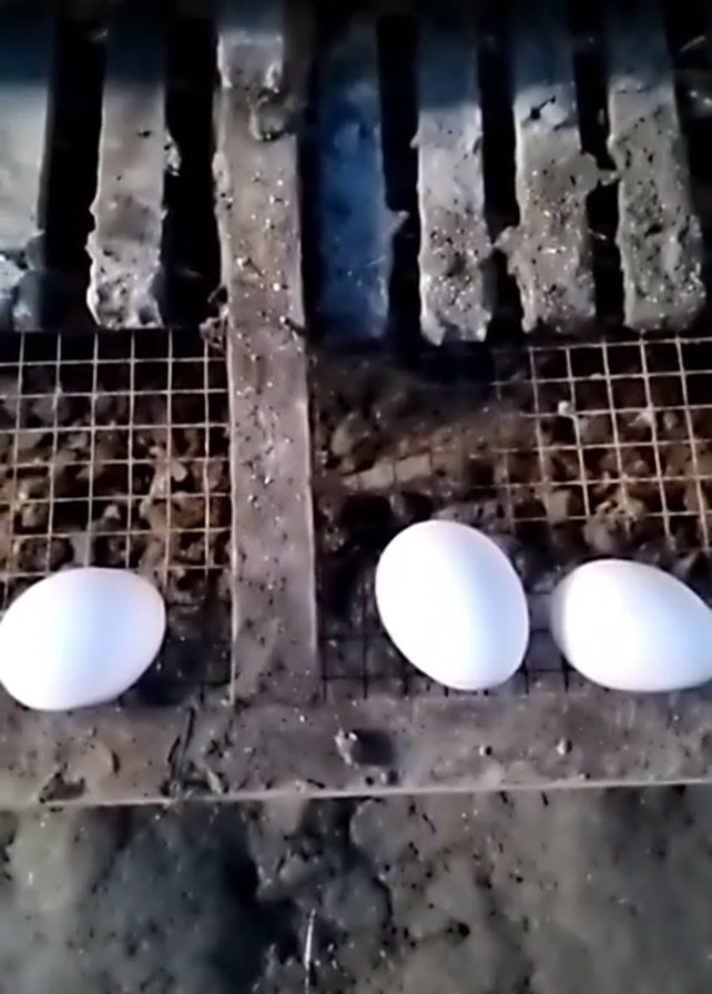 - "three white eggs sitting on a wire mesh floor under metal slats" by FM-sAcf03, licensed under CC BY 4.0