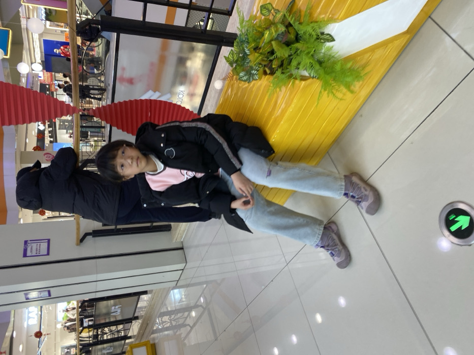 This image depicts an indoor scene within a multi-level shopping mall located in Linghe, China. In the immediate foreground, a young girl with short dark hair and rectangular glasses is seated on a bright yellow slatted bench. She is dressed in a black padded winter jacket featuring a silver reflective stripe on the left sleeve, a light pink long-sleeved shirt, light blue ripped jeans, and purple-grey lace-up sneakers. Her hands are resting in her lap, and her gaze is directed slightly to the right of the frame with a neutral expression. To her right, at the end of the yellow bench, is a white planter containing a cluster of artificial green foliage. The highly reflective light-colored tiled floor beneath her feet displays a circular metal inlay with a prominent green downward-pointing arrow. Behind the girl and positioned to her left, an adult figure, mostly obscured, is visible leaning over a dark metal railing topped with a light wooden handrail. This individual wears a dark hooded winter coat. The background reveals an upper level of the mall, where several blurred figures of shoppers or staff are present. Various storefronts are visible, including a partial 'FILA' sign. Overhead, decorative elements include a large red spiral structure and smaller red lantern-like ornaments. The entire scene is brightly illuminated by artificial overhead lighting.