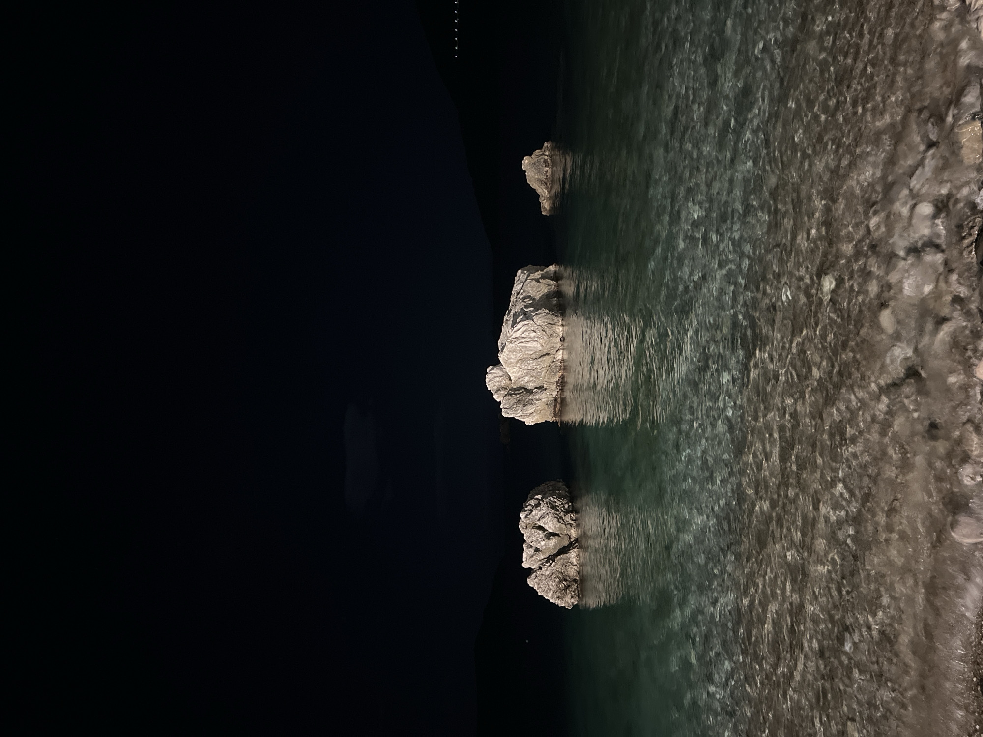 At nighttime in Herceg Novi, Montenegro, three large rocks jut out of the water near a rocky shore