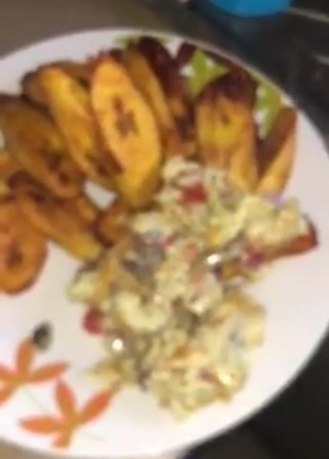 A plate of food is shown on a kitchen counter. The plate is white with a floral design around the edge. On the plate are fried plantains and scrambled eggs. The plantains are golden brown and cut into diagonal slices. The scrambled eggs contain red and white pieces. In the background, there is a clear container and a blue container. The video is initially out of focus but becomes more focused on the plate of food.