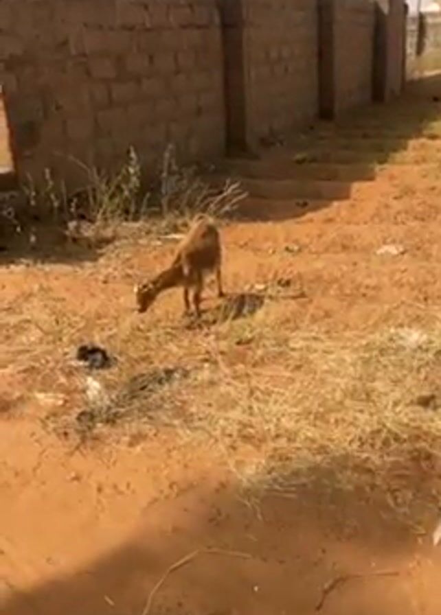 goat grazing on sparse vegetation near a tan brick wall. The ground is sandy and dry. The wall is made of uniform blocks with square pillars spaced along its length. In the background, a satellite dish is visible atop a building.