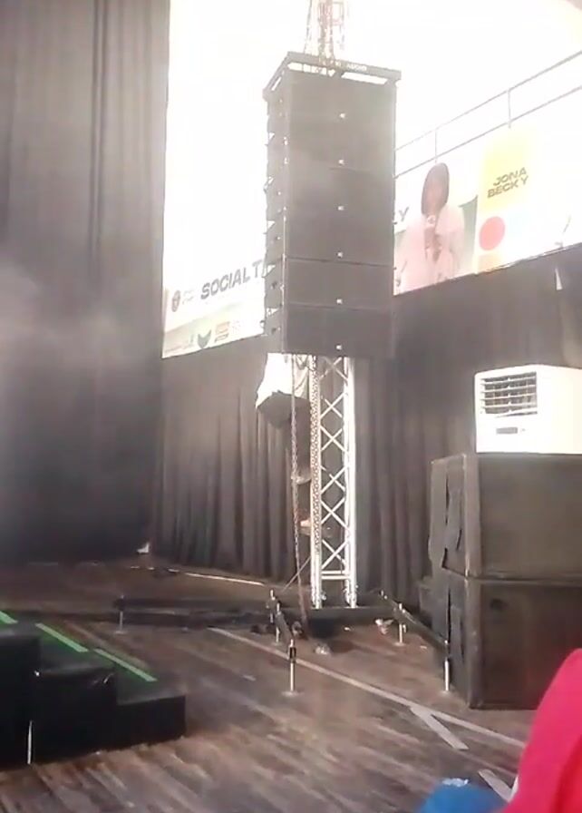 The video captures a man working on the stage setup. The setting appears to be an indoor stage area with black curtains serving as a backdrop. A large speaker system, consisting of multiple stacked boxes, is suspended by a metal truss. The man, wearing a white shirt and a cap, is seen walking around the speaker system. To the right, there's a large banner featuring an image of a person and text that partially reads "Jona Becky". Next to it, there is an air conditioning unit. In the foreground, there are green stage elements, and the bottom right corner shows a person wearing a red shirt and blue jeans. The flooring appears to be wooden and there is some haze in the air.