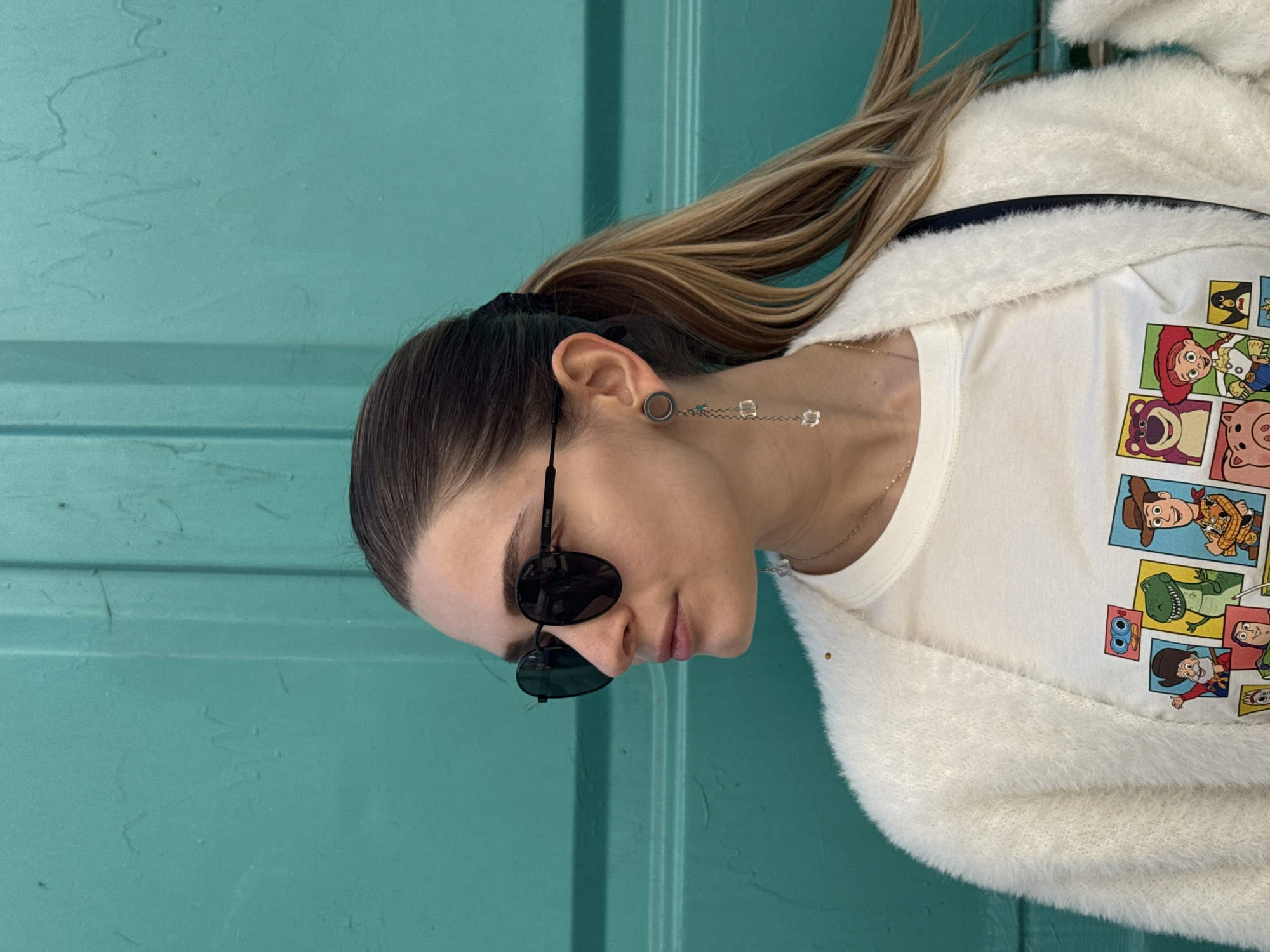A woman with brown and blonde hair tied back in a ponytail is standing in front of a blue painted door. She is wearing sunglasses, earrings, a white t-shirt with Toy Story characters printed on it, and a fluffy white cardigan. The location is unknown and cannot be identified as Reutov, Russia from the image.